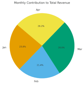 Pie Chart (Revenue Contribution): March emerges as the top-performing month, contributing 28.5% of total revenue.