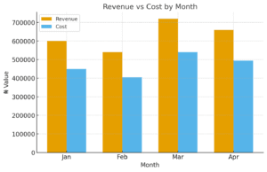 Bar Chart (Revenue vs. Cost): Displays the gap between sales and costs, illustrating steady profit spread.